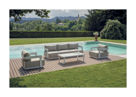 Salotto da giardino in alluminio BIANCO SET ANTIBES da 2 poltrone + 1 divano a 3 posti + 1 tavolino in gres effetto pietra