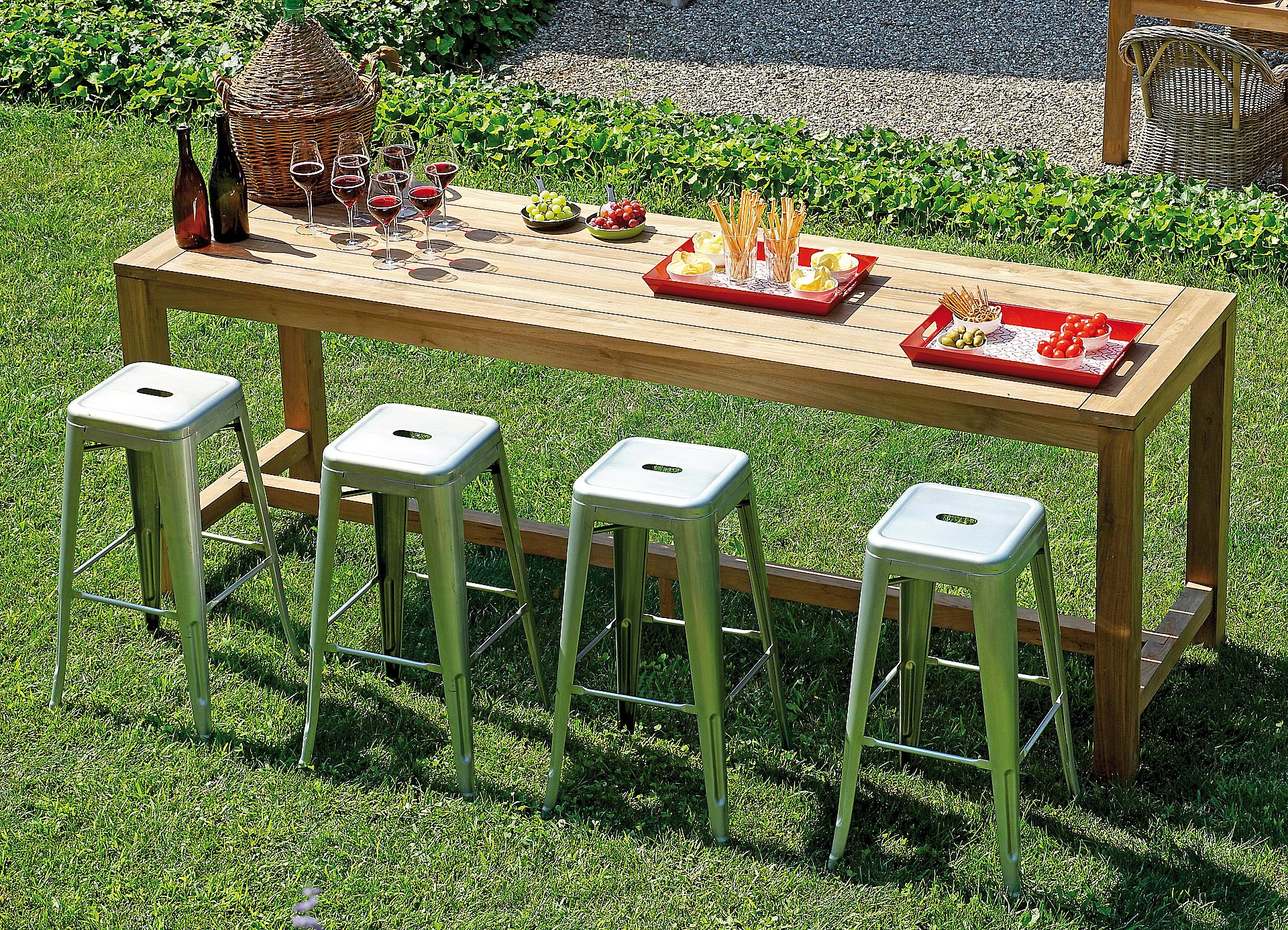 Realizzato in teak riciclato, ogni bancone è unico nelle venature e nelle tonalità del legno, valorizzando l’autenticità del materiale e garantendo elevata resistenza nel tempo. Il piano ampio consente di servire comodamente drink, aperitivi e snack, rendendolo perfetto per momenti conviviali e occasioni speciali.