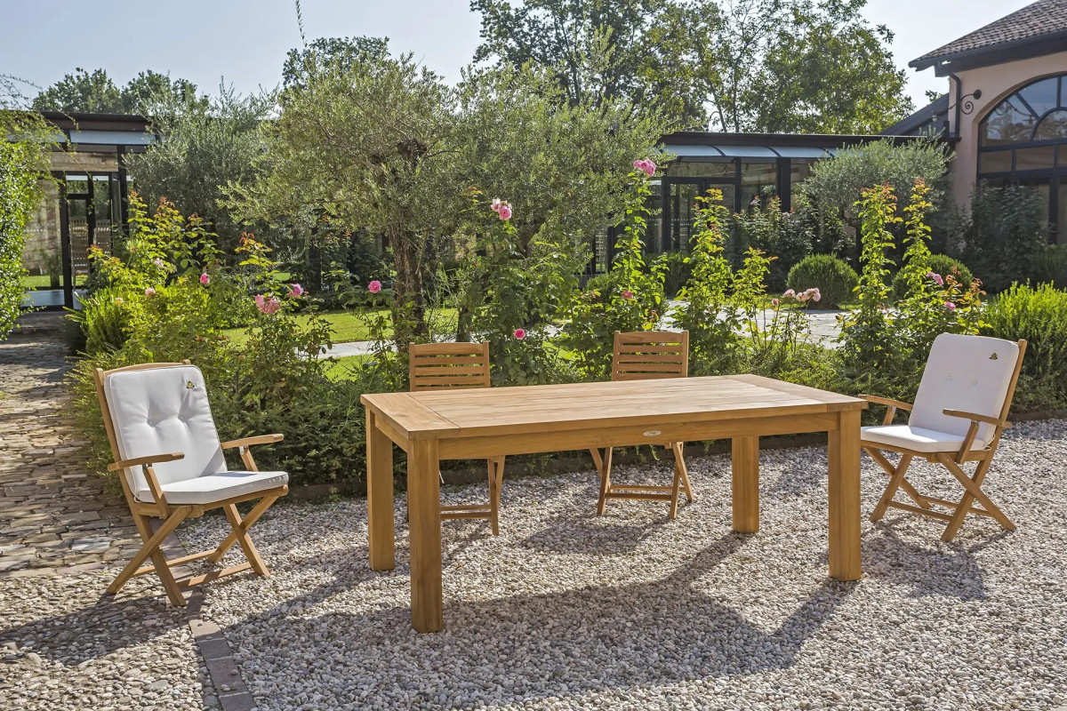 Realizzato in pregiato legno teak, uno dei materiali più apprezzati per l’arredo outdoor, il tavolo ginevra unisce estetica naturale e straordinaria durata nel tempo. Il teak è infatti ricco di oli naturali che lo proteggono dagli agenti atmosferici, rendendolo particolarmente resistente a pioggia, umidità e raggi solari. Questo permette al tavolo di mantenere la sua bellezza nel tempo anche con un utilizzo continuativo all’esterno.