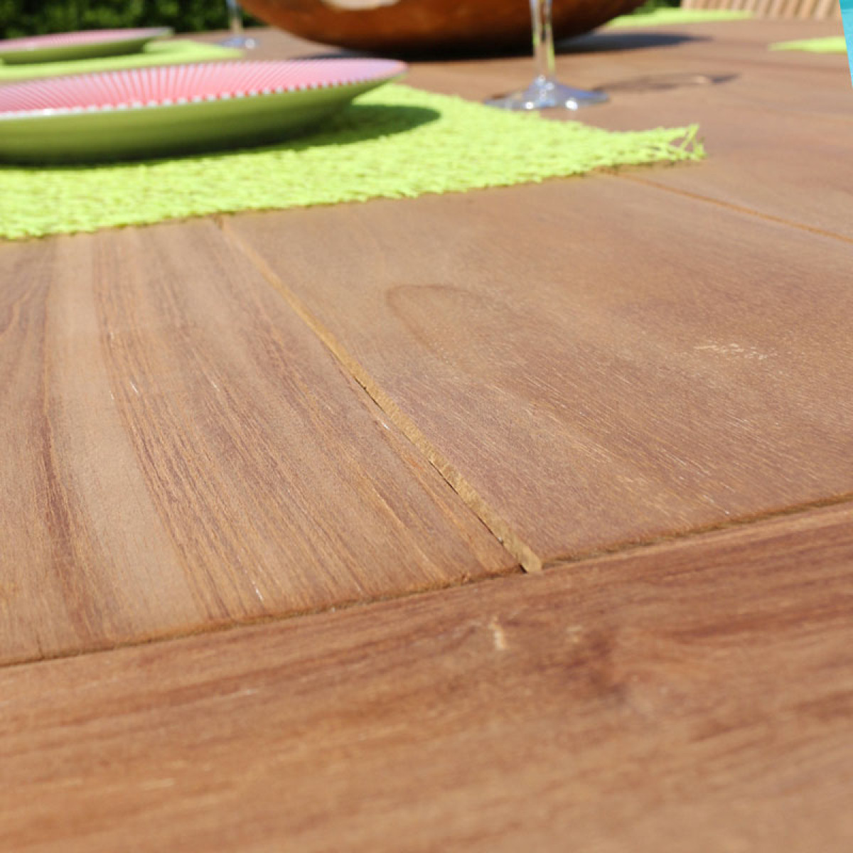 Il teak è uno dei legni più apprezzati per l’arredo da esterno. Proveniente dalle foreste dell’Asia tropicale, è naturalmente ricco di sostanze oleose che gli conferiscono eccellenti proprietà idrorepellenti. Questo lo rende estremamente resistente all’umidità, al sole e agli agenti atmosferici, mantenendo nel tempo la sua bellezza e la sua solidità.