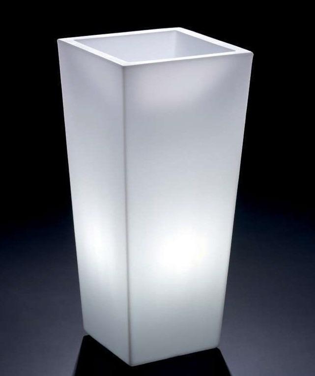 L'elemento d'arredo ideale per disegnare ogni spazio. Un tocco di stile che non manca di calore ed originalità. Cache-pot luminoso per uso esterno ed interno, in versione quadrato alto in tre misure. Prodotto in versione lampada CFL Outdoor e batteria led RGB Outdoor.