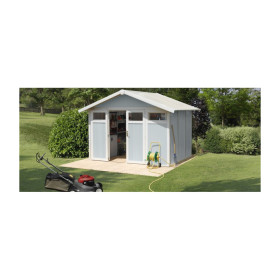 Casetta in resina da giardino Utility 7.5 Grosfillex cm 315x239 parete grigio- azzurro profili bianchi