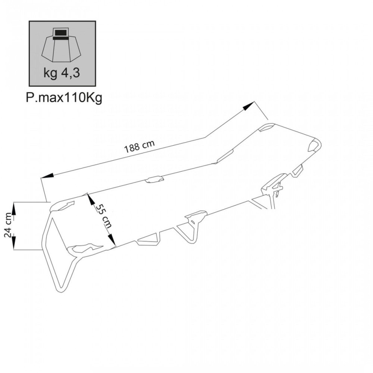 Disponibile BLU o AZZURRO struttura in metallo Ø 22 x 1 mm, portata max 110 kg, tessuto textilene 1 x 1 Dimensioni: cm 188 x 55 x 24,5 h