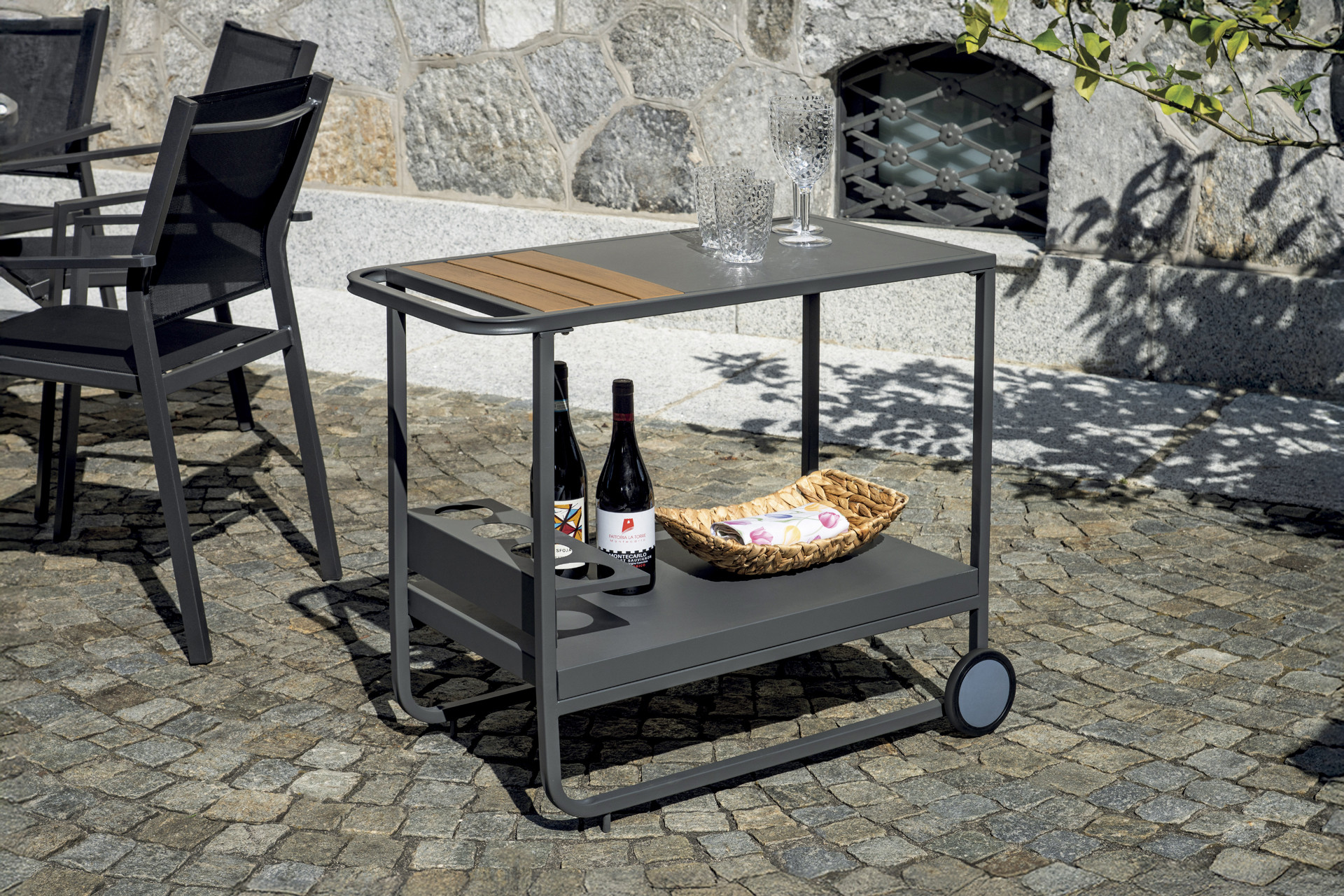La struttura in ferro garantisce stabilità e resistenza, mentre il piano in Resin Wood assicura durabilità nel tempo e facilità di manutenzione, risultando ideale per l’uso in giardino, terrazzo o bordo piscina. Le ruote integrate permettono di spostare il carrello con semplicità, rendendolo perfetto come supporto durante pranzi, aperitivi e momenti conviviali all’aria aperta.