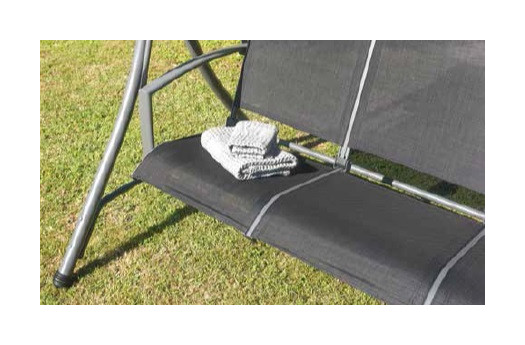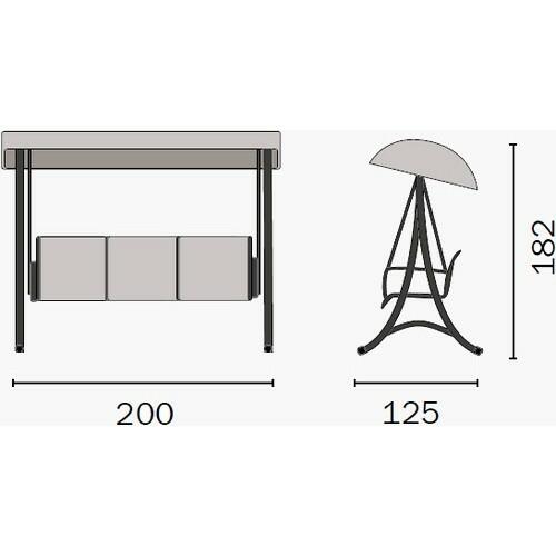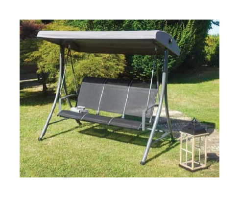 Dondolo a tre posti con struttura in ferro ANTRACITE. Seduta in textilene color GRIGIO, tettuccio in poliestere color GRIGIO.