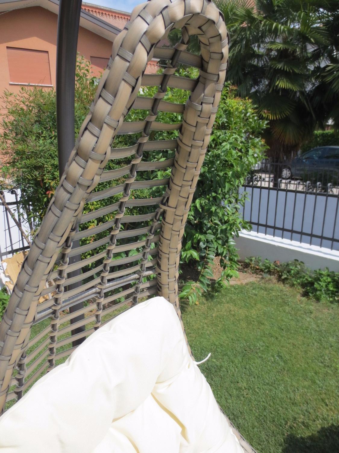 Poltrona sospesa dondolante in polyrattan spazzolato avano da 12 mm con morbidissimo cuscino imbottito color sabbia per creare una zona relax dal comfort ottimale.