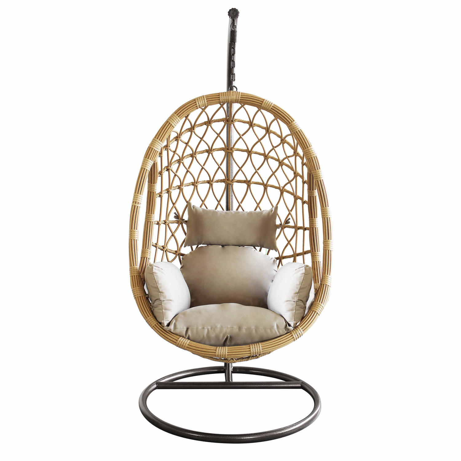 Poltrona sospesa dondolante in polyrattan spazzolato con morbidissimo cuscino imbottito color sabbia per creare una zona relax dal comfort ottimale.