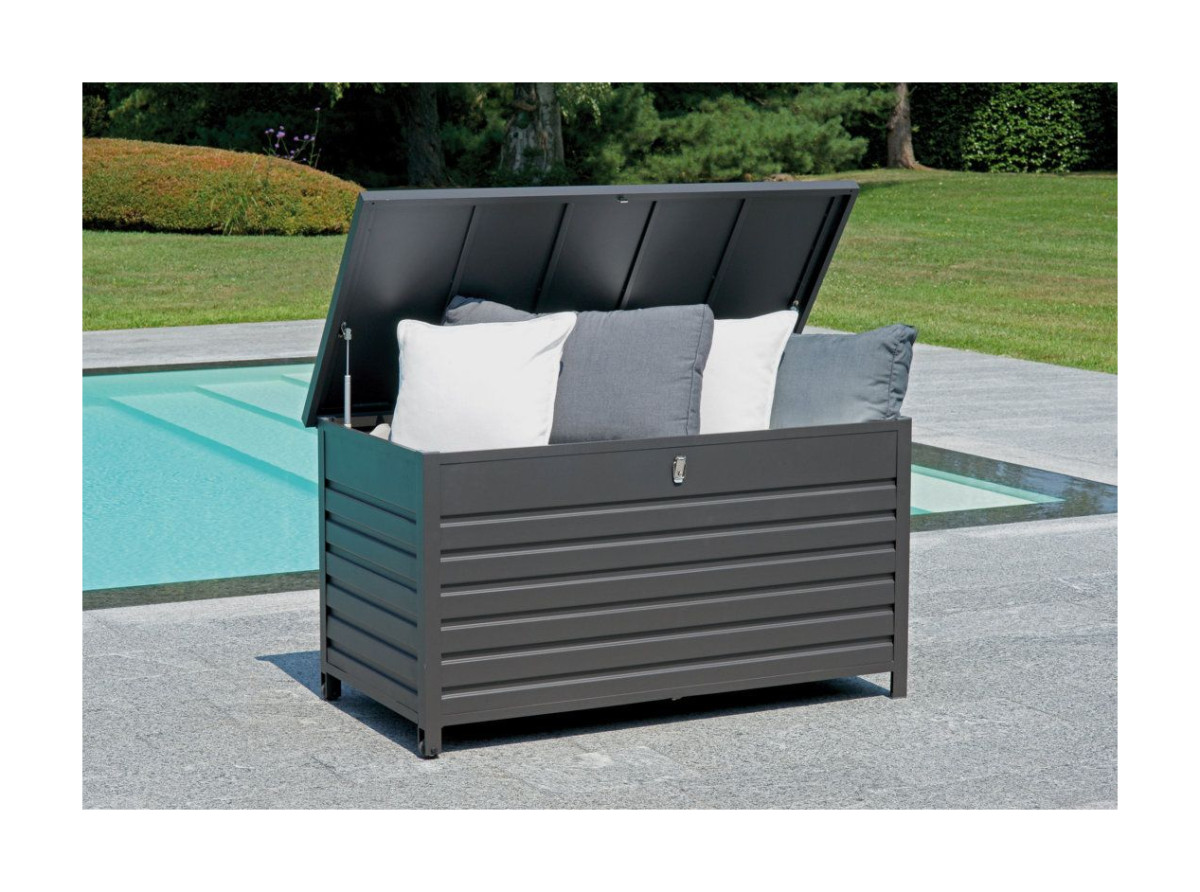 Contenitore porta oggetti da esterno, da posizionare vicino alla piscina, sotto un portico o vicino alla zona living, dove poter riporre in modo sicuro e facile tutti gli oggetti. La struttura è in alluminio di colore antracite o bianca, con ruote annesse. Ciò consente di poterlo agevolmente spostare senza fatica dove più vi è comodo. Le dimensioni lo rendono un articolo molto valido da avere e utilizzare, per rendere lo spazio esterno della casa sempre in ordine e pulito.
