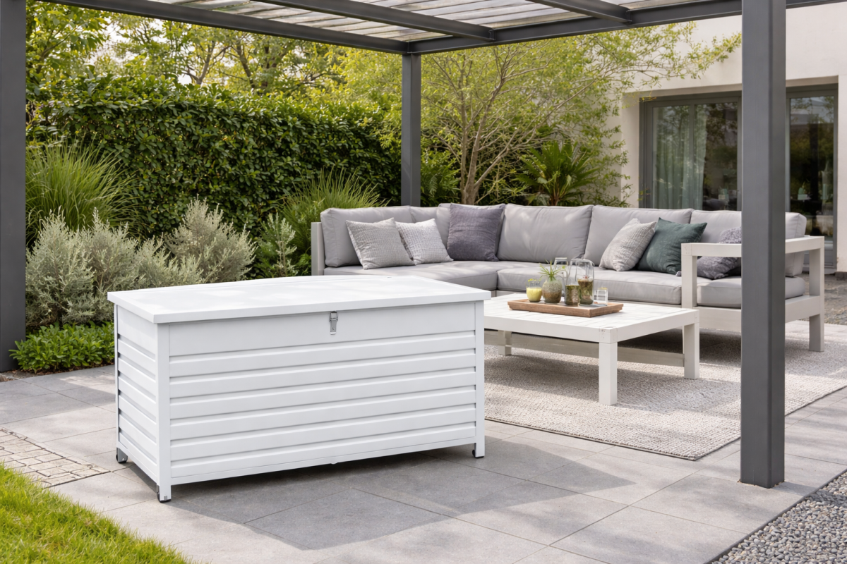 Il Box Portacuscini Memphis è realizzato in alluminio (grigio antracite o bianco) e garantisce una straordinaria resistenza agli agenti atmosferici, rendendolo inalterabile allo scorrere del tempo e, grazie alle linee essenziali e pulite, anche all?evoluzione del gusto estetico. Con apertura a pistoni, è dotato di ruote che agevolano lo spostamento e la collocazione in qualsiasi superficie dello spazio outdoor.
