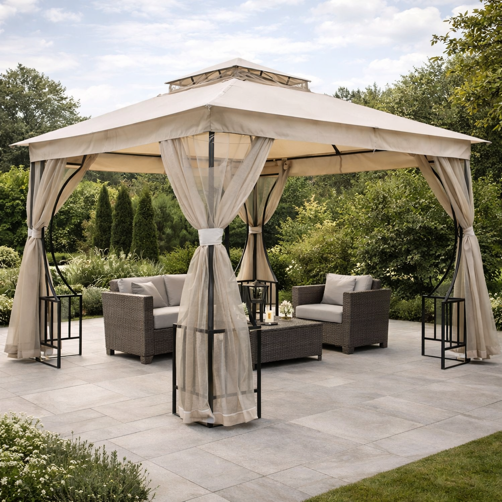 Il telo tortora abbinato alla struttura nera dona al gazebo un aspetto sobrio ed elegante, facilmente abbinabile ad arredi da esterno moderni o classici. Perfetto per ambienti residenziali e spazi conviviali.