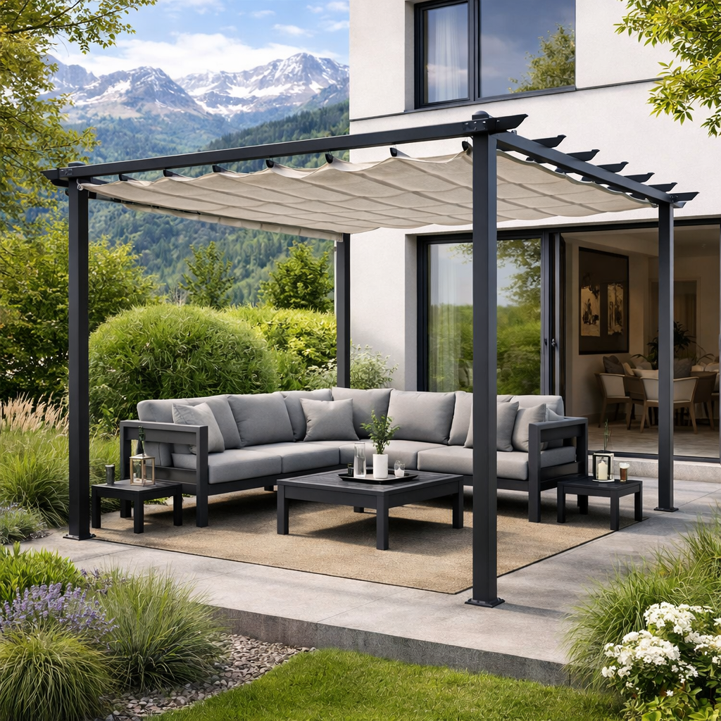 Il Gazebo pergola ASTORIA 3x4 metri è la soluzione ideale per creare una zona d’ombra elegante e funzionale in giardino, terrazza o area piscina. Il design moderno e lineare, abbinato alla copertura scorrevole richiudibile, permette di regolare facilmente luce e protezione in base alle esigenze quotidiane.