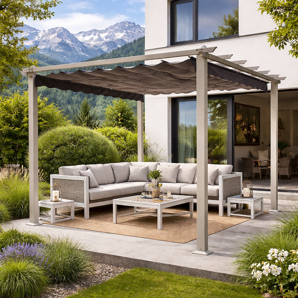 Il Gazebo pergola ASTORIA 3x3 metri è la soluzione ideale per creare una zona d’ombra elegante e funzionale in giardino, terrazza o area piscina. Il design moderno, abbinato alla copertura scorrevole su binario, consente di regolare facilmente luce e protezione in base alle esigenze quotidiane.