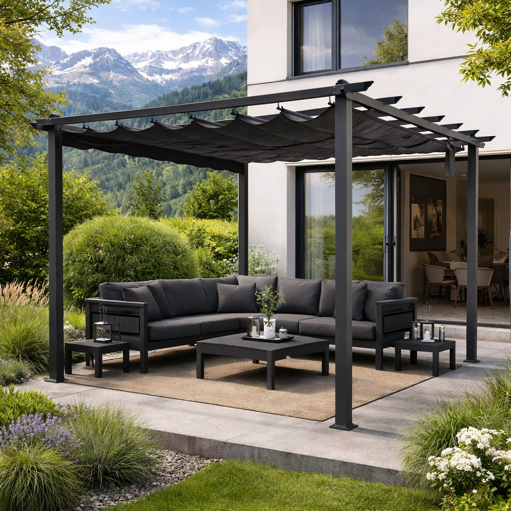 Il Gazebo pergola ASTORIA 4x4 metri è la soluzione ideale per coprire ampi spazi esterni con eleganza e funzionalità. Il design moderno e pulito, unito alla copertura scorrevole su binario, consente di modulare facilmente ombra e protezione in base alle condizioni climatiche, rendendolo perfetto per giardini, terrazze e aree piscina.