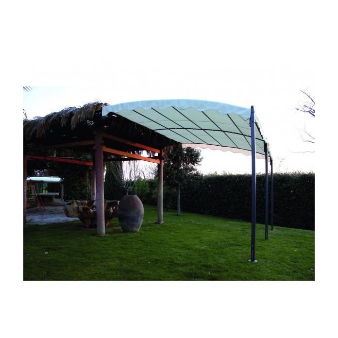 Struttura in acciaio verniciato colore grigio antracite - 3 pali d'appoggio 40x40 mm. - 10 stecche in metallo 10x20 mm. - Copertura in poliestere 180 gr./mq. colore beige