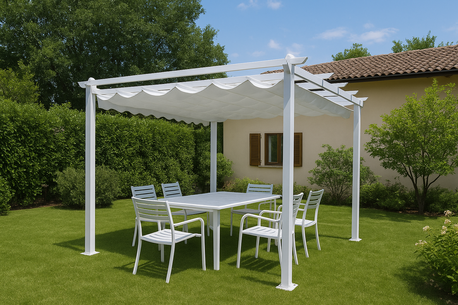 Il telo di copertura è in poliestere rinforzato da 180 g/m², colore bianco, idrorepellente e resistente alle intemperie. La copertura scorrevole può essere completamente chiusa in caso di vento forte o durante il periodo invernale, proteggendo la struttura quando non in uso.