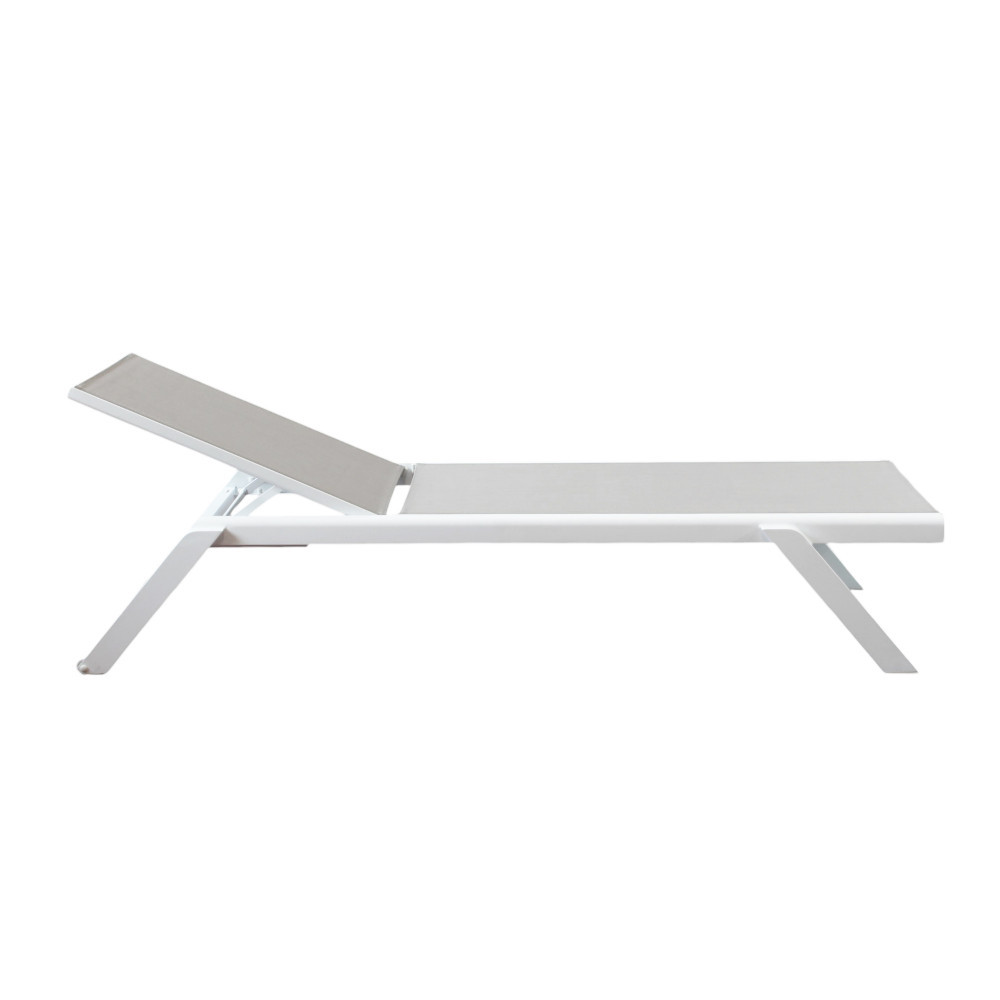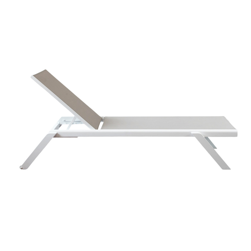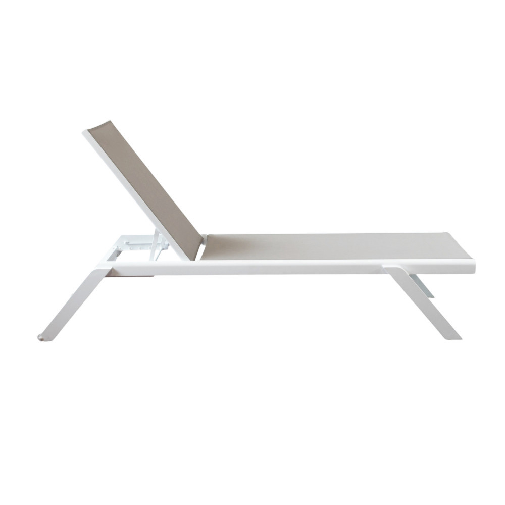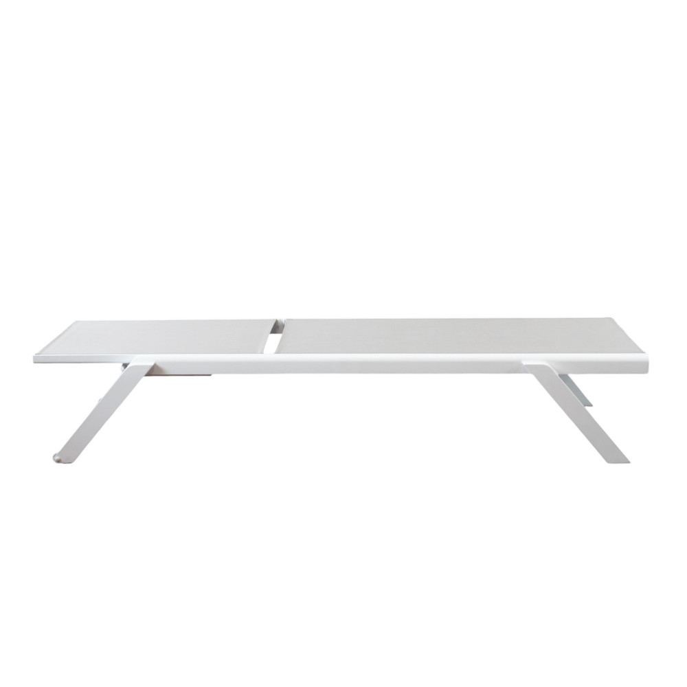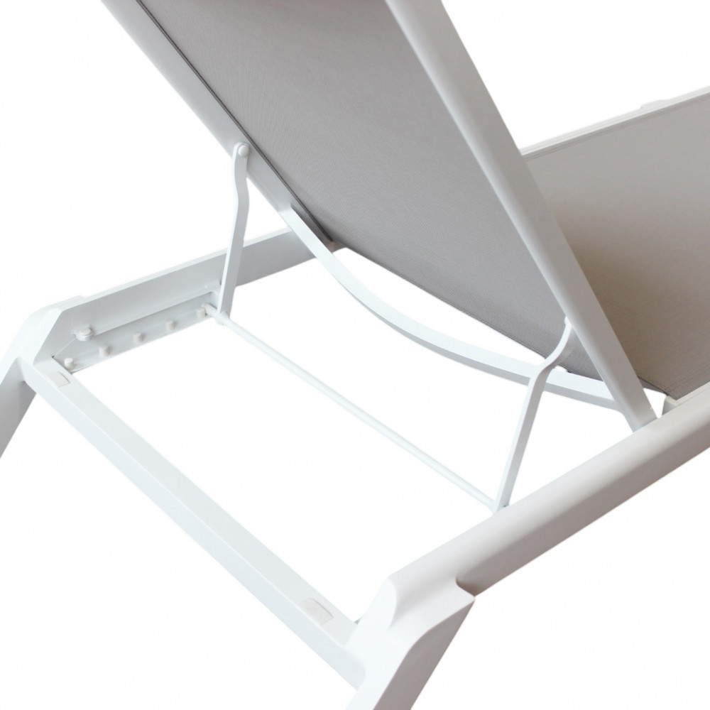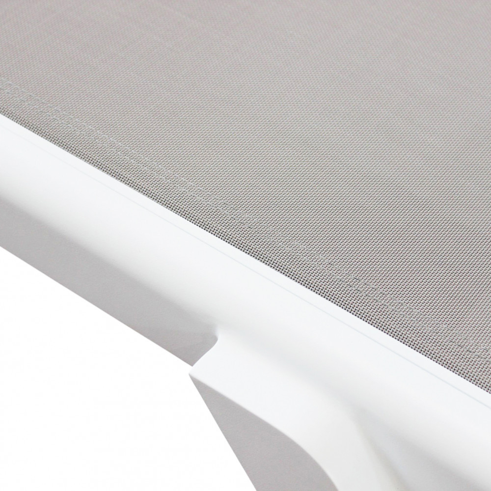 La struttura è realizzata in alluminio verniciato di colore bianco, materiale noto per la sua leggerezza e resistenza agli agenti atmosferici. Il rivestimento in textilene assicura traspirabilità, comfort e facilità di manutenzione, rendendo il lettino ideale per un utilizzo intensivo in ambienti esterni.