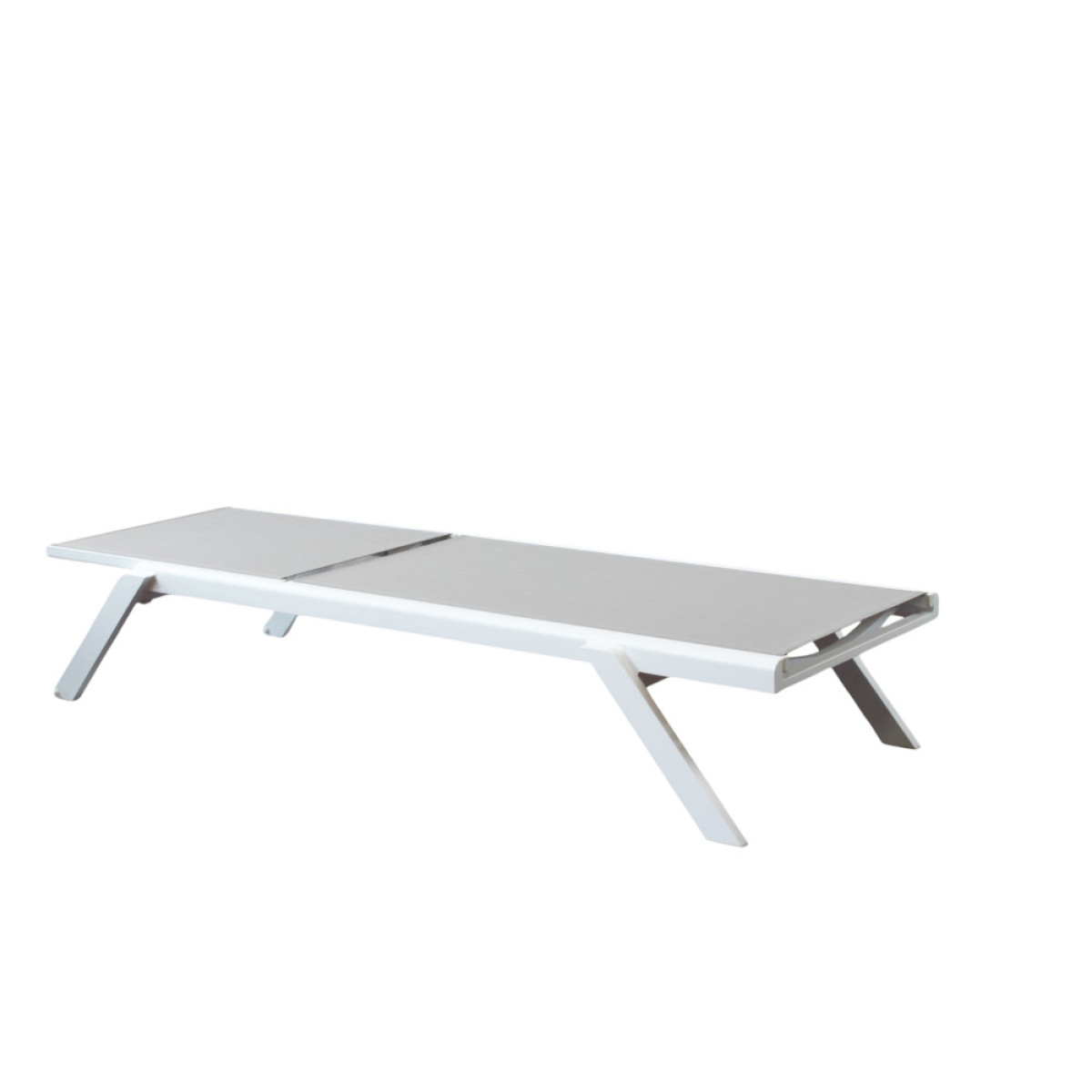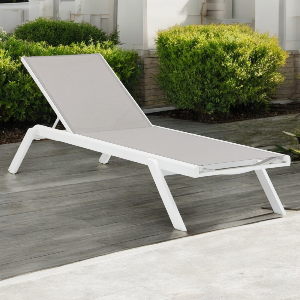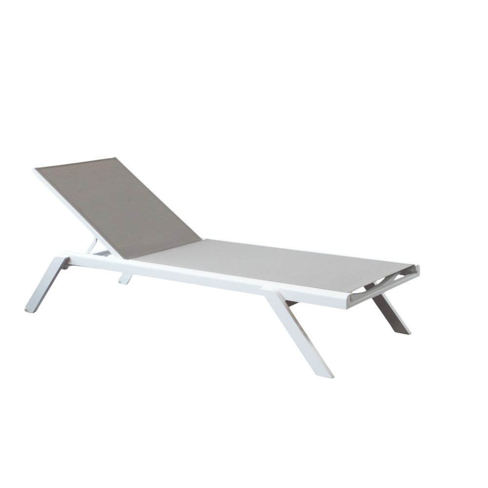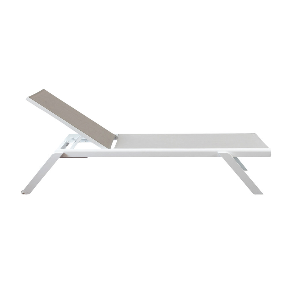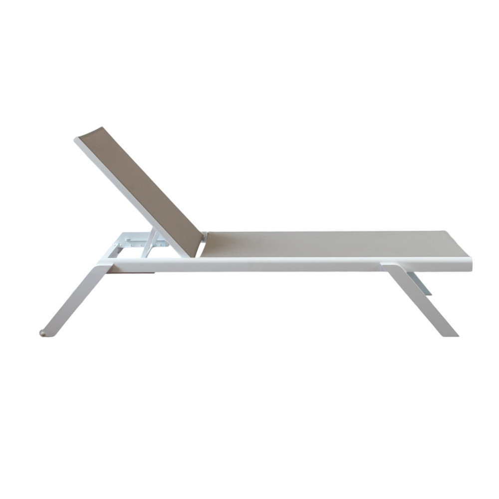 La struttura è realizzata in alluminio verniciato di colore bianco, materiale noto per la sua leggerezza e resistenza agli agenti atmosferici. Il rivestimento in textilene assicura traspirabilità, comfort e facilità di manutenzione, rendendo il lettino ideale per un utilizzo intensivo in ambienti esterni.