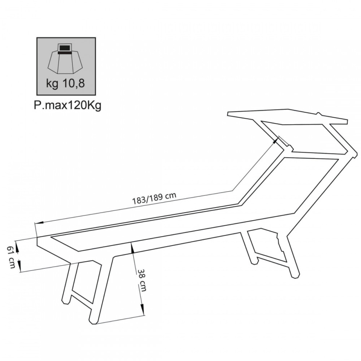 Disponibile BLU, BIANCO, BEIGE MELANGE struttura in alluminio 43x42 mm regolabile in 2 posizioni portata max 120 kg, tessuto in textilene 2 x 1 Dimensioni: cm 183/189 x 61 x 38 h
