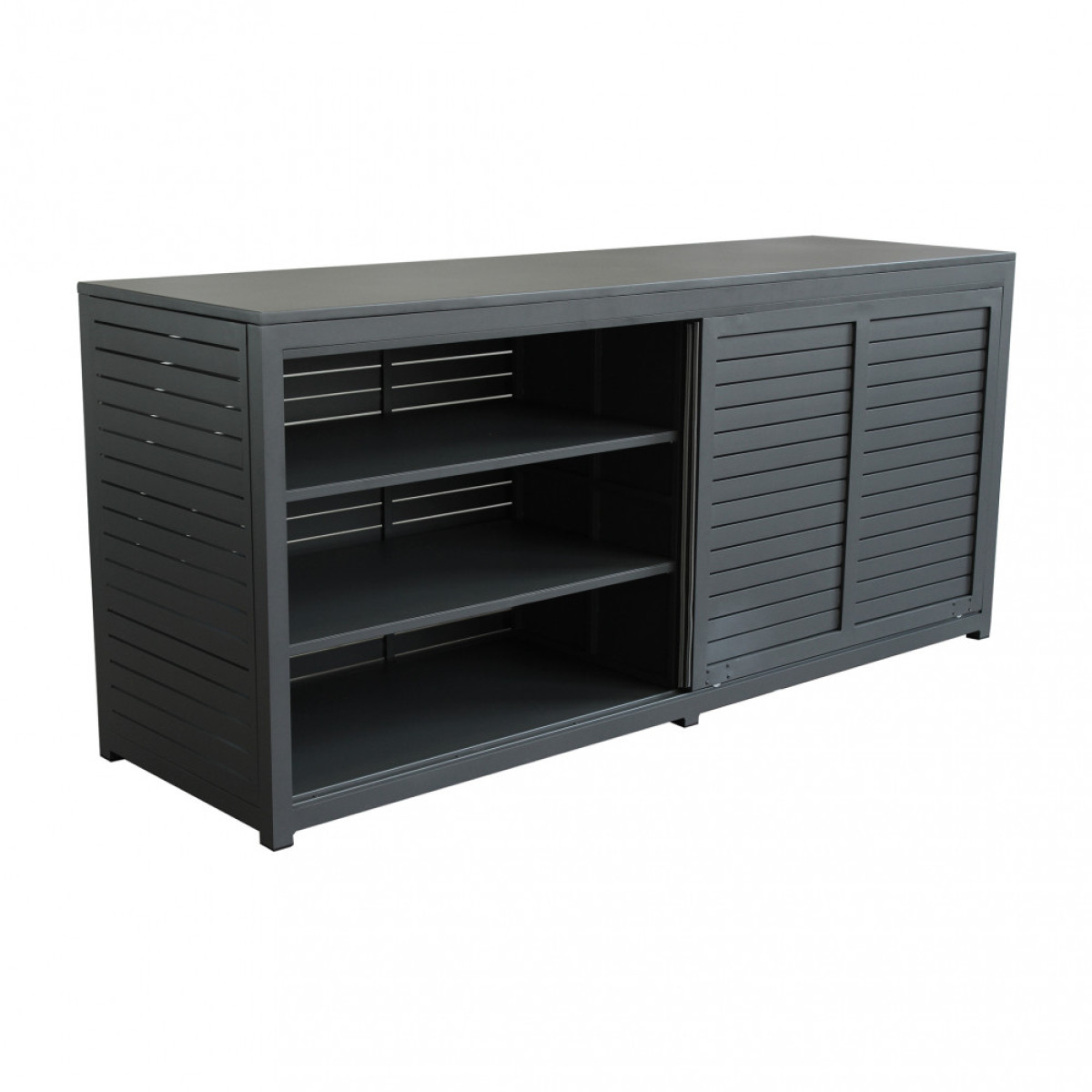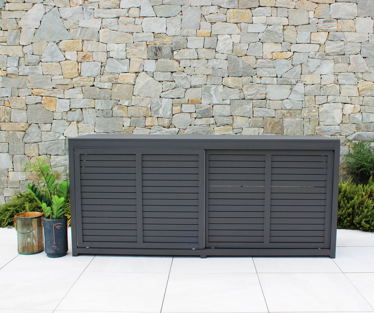 La struttura è realizzata in alluminio verniciato color antracite, materiale leggero e altamente resistente agli agenti atmosferici, alla corrosione e all’umidità, garantendo durata nel tempo e ridotta manutenzione. Le dimensioni generose offrono un ampio piano di appoggio e una capacità contenitiva ottimale, mantenendo un’estetica pulita e contemporanea.