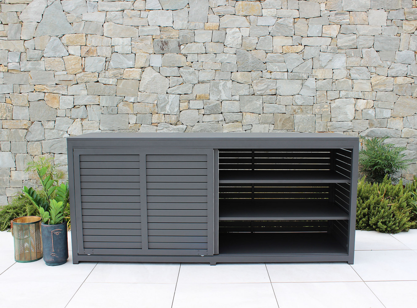 Un arredo pratico e raffinato, pensato per valorizzare gli spazi esterni con funzionalità, ordine e uno stile deciso e contemporaneo.