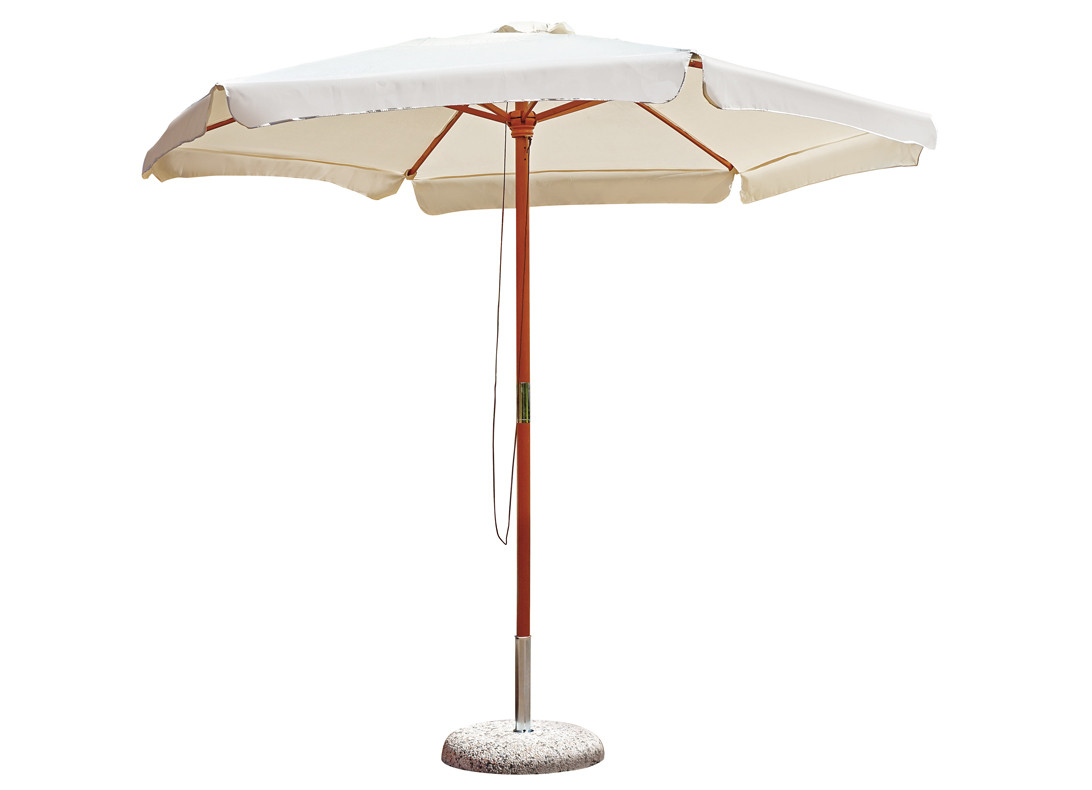 Le robuste bacchette da 20 x 24 mm sostengono un resistente telo in poliestere da 230 gr. colore ecrù, pensato per offrire un’eccellente protezione dal sole e una lunga durata nel tempo. Il tessuto è dotato di volante e sistema antivento, che favorisce la circolazione dell’aria migliorando la stabilità dell’ombrellone anche nelle giornate ventilate.