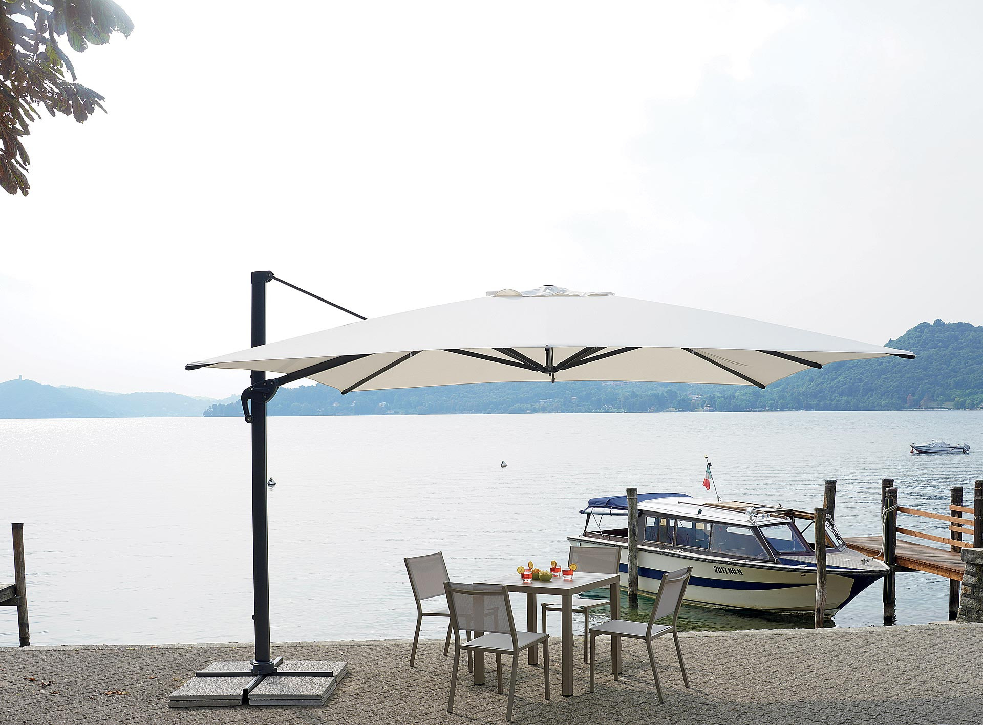 La struttura in alluminio color antracite, solida e resistente agli agenti atmosferici, è abbinata a un telo in poliestere 240 g/m² color ecrù, progettato per offrire un’elevata protezione solare e una resa estetica raffinata. Il sistema di apertura a manovella rende l’utilizzo semplice e fluido, mentre la rotazione a 360° consente di orientare l’ombra in base alla posizione del sole durante tutta la giornata.