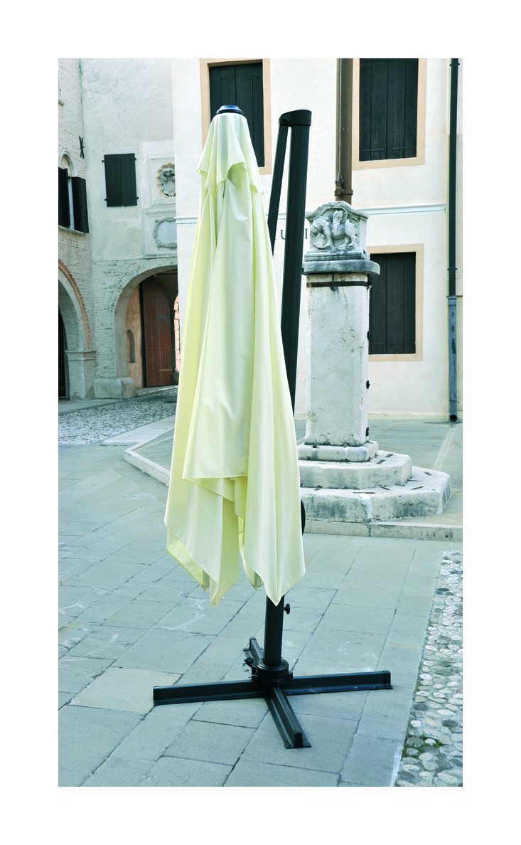 L’apertura è agevole grazie al maniglione manuale, mentre il sistema antivento migliora la sicurezza e la resistenza alle sollecitazioni atmosferiche. Il telo in poliestere da 180 g/m², di colore ecrù, è idoneo a schermare efficacemente dai raggi solari, offrendo un’ombra piacevole e uniforme.