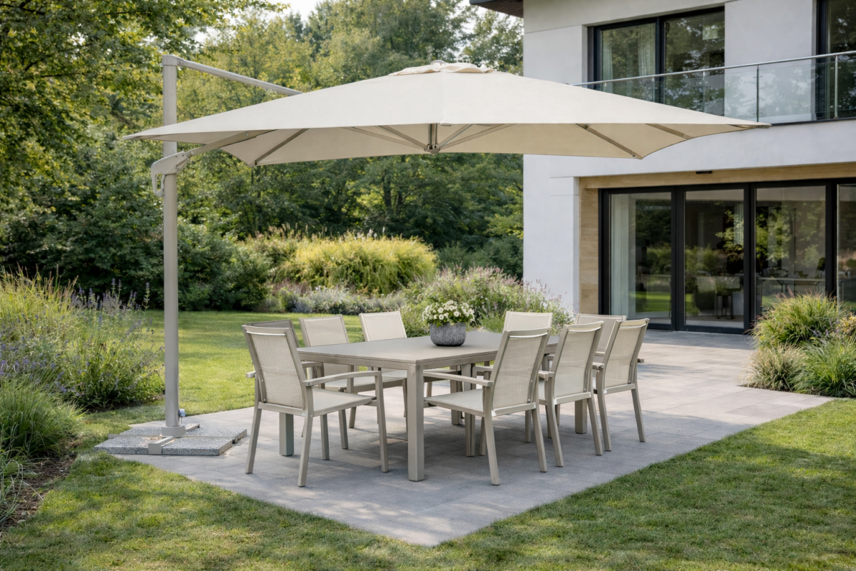L’ombrellone COLORADO 3×3 rappresenta una soluzione raffinata e funzionale per l’arredo di spazi esterni residenziali e professionali. Il palo laterale in alluminio verniciato color creta consente di sfruttare completamente l’area sottostante, offrendo comfort e massima libertà di movimento.