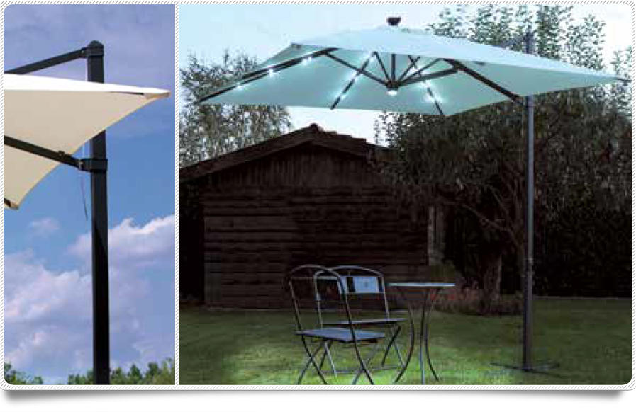 L'ombrellone da giardino con palo laterale garantisce il massimo spazio utile senza alcun ingombro al di sotto dell'ombrellone. La struttura in alluminio offre il meglio in termini di durata e resistenza agli agenti atmosferici. L'apertura è semplificata dal sistema a monella che rende l'operazione semplice e scorrevole. Il sistema retrattile limita l'ingombro anche quando non si utilizza l'ombrellone. Questo ombrellone ` fornito completo di luci a led alimentate da un pannello superiore solare per permettere un'installazione semplice ed immediata.