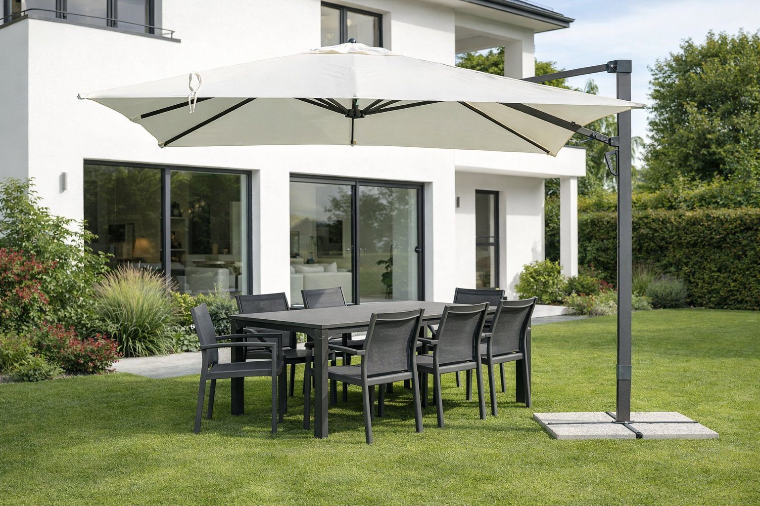 L’ombrellone ALABAMA 3×4 è progettato per offrire un’ampia superficie d’ombra con un’estetica sobria ed elegante, ideale per giardini, terrazze, dehors, bar e strutture ricettive. La combinazione tra struttura antracite e telo color ecrù garantisce un impatto visivo moderno e facilmente abbinabile a qualsiasi arredo outdoor.