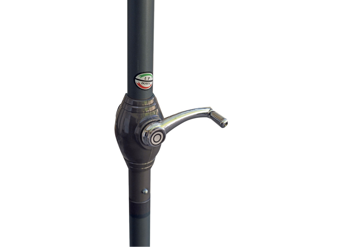 La struttura in alluminio verniciato a polvere color antracite garantisce solidità, leggerezza e resistenza agli agenti atmosferici. Il meccanismo di apertura e chiusura a manovella è pratico e leggero, permettendo un utilizzo semplice e immediato anche in spazi contenuti.