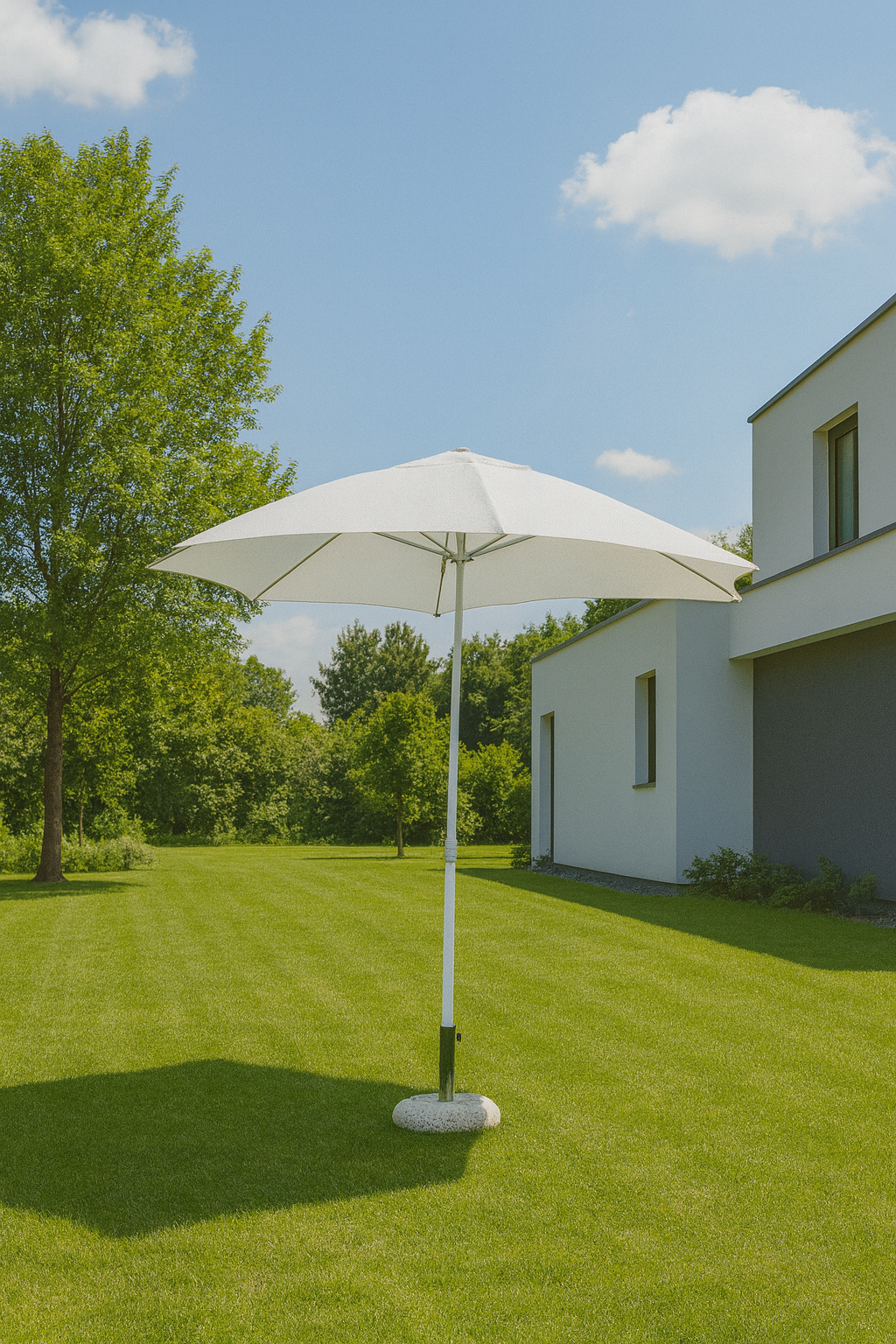 Il palo centrale in alluminio bianco Ø 38 mm garantisce stabilità e un’estetica neutra facilmente abbinabile a qualsiasi arredo esterno.