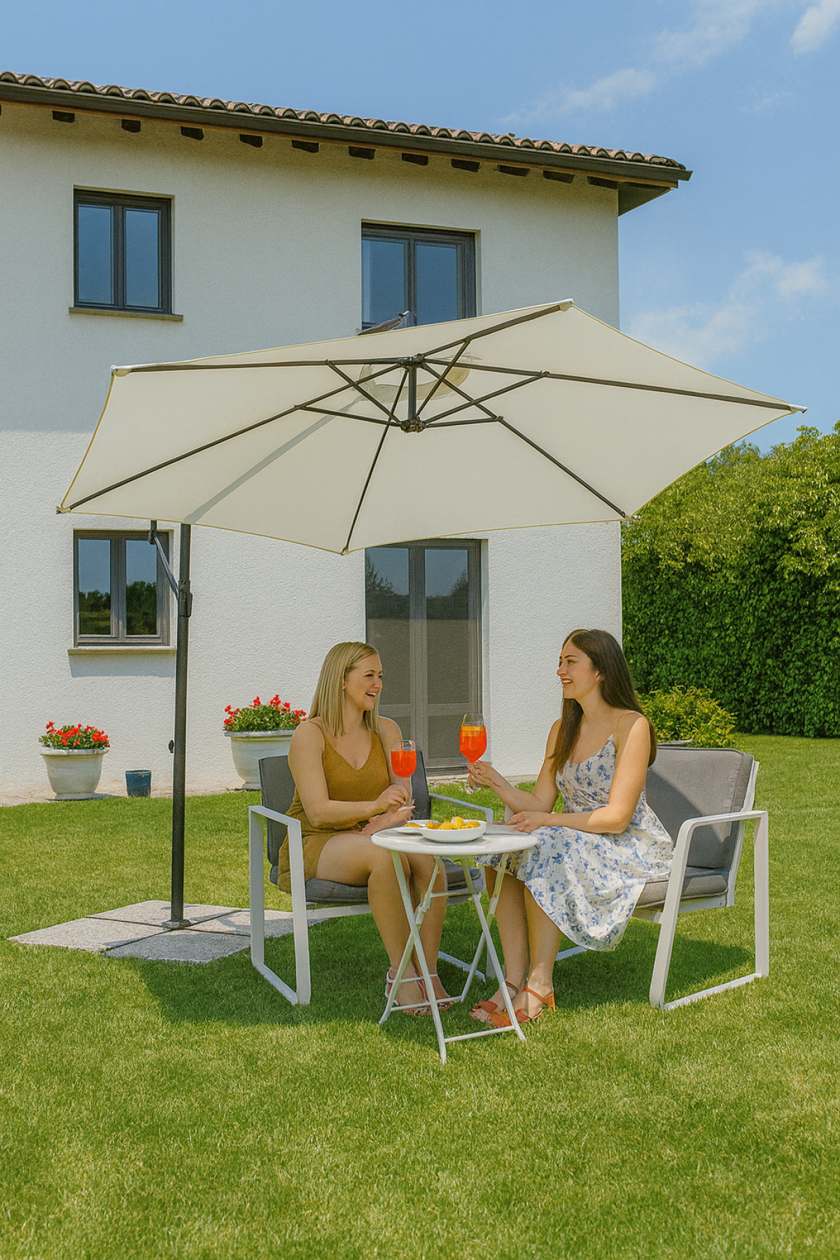 L’ombrellone da giardino ERIS Ø 3 metri è una soluzione pratica ed elegante per creare zone d’ombra confortevoli in giardino, terrazzo o spazi esterni domestici. Grazie al palo laterale e al design essenziale, consente di sfruttare al meglio lo spazio sottostante senza l’ingombro del palo centrale.
