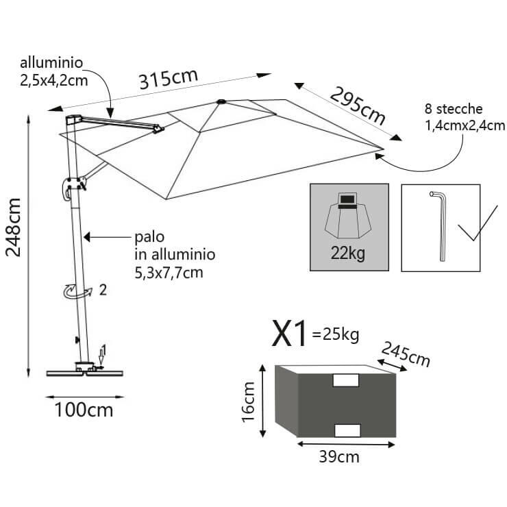 Il sistema di apertura con manovella assicura un'apertura lineare e scorrevole, con un semplice gesto. Il palo è dotato di prefori per facilitare l'inclinazione del telo di copertura: basterà inserire il supporto standard per decidere l'inclinazione ideale dell'ombrellone, adattandolo anche in presenza di impedimenti superiori.