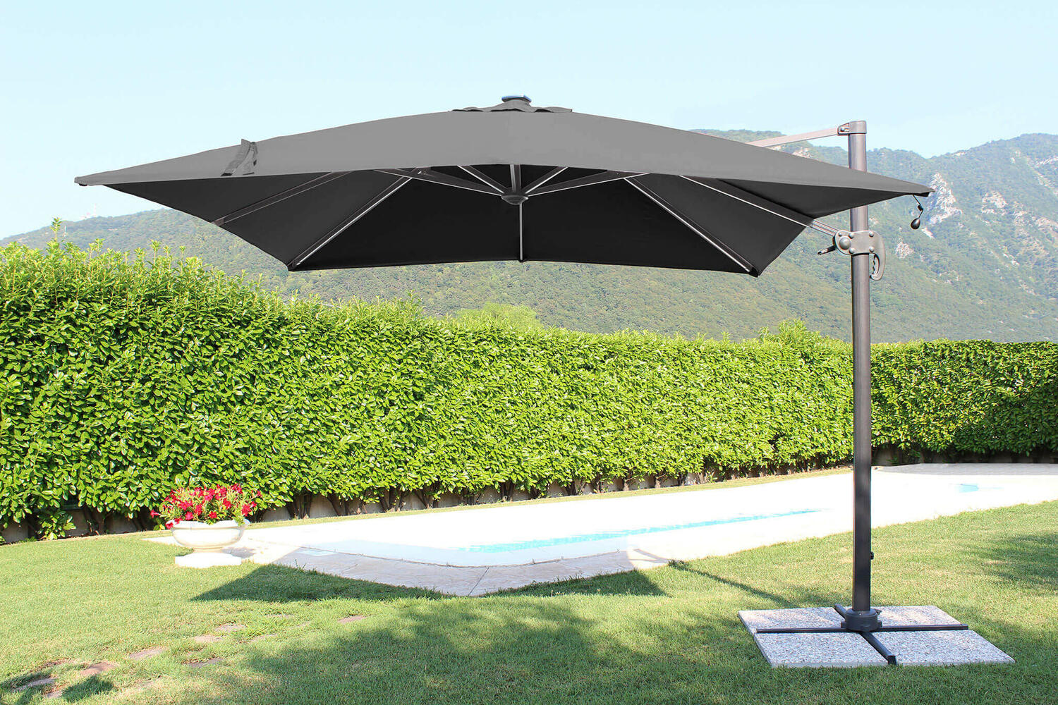 La gamma di ombrelloni per esterno propone svariate soluzioni proposte in differenti misure: la nostra gamma è l'unica ad offrire questo elegante ed innovativo ombrellone da giardino con luci LED integrate.