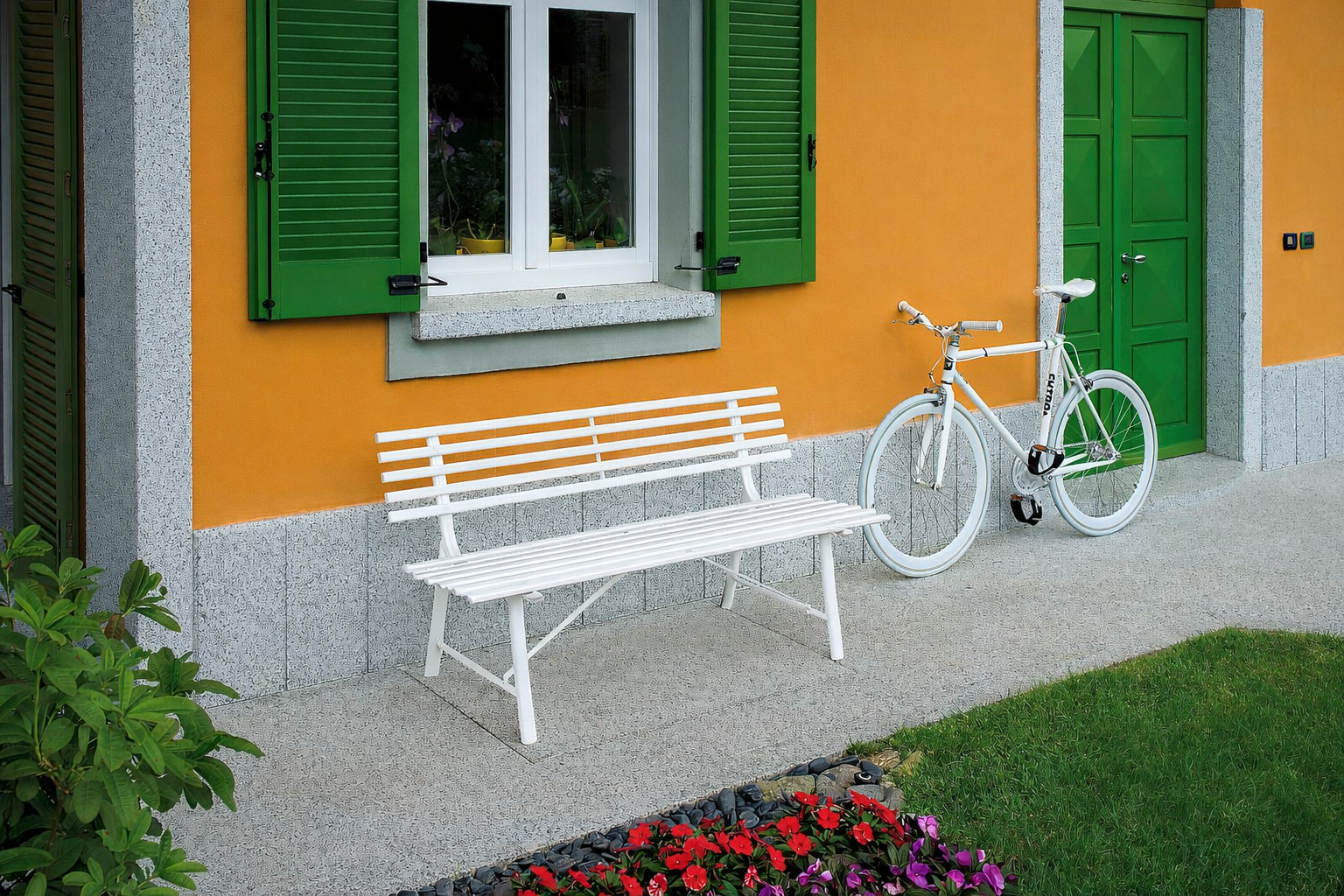 La finitura avorio esalta le linee classiche della panca, rendendola facilmente abbinabile a diversi stili di arredo outdoor.
