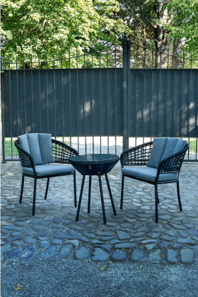 Linee pulite e proporzioni equilibrate rendono il salottino adatto a contesti outdoor contemporanei, mantenendo una forte versatilità estetica. L’abbinamento cromatico tra struttura nera e tessuti grigi crea un effetto raffinato e facilmente integrabile con diversi stili di arredo esterno.
