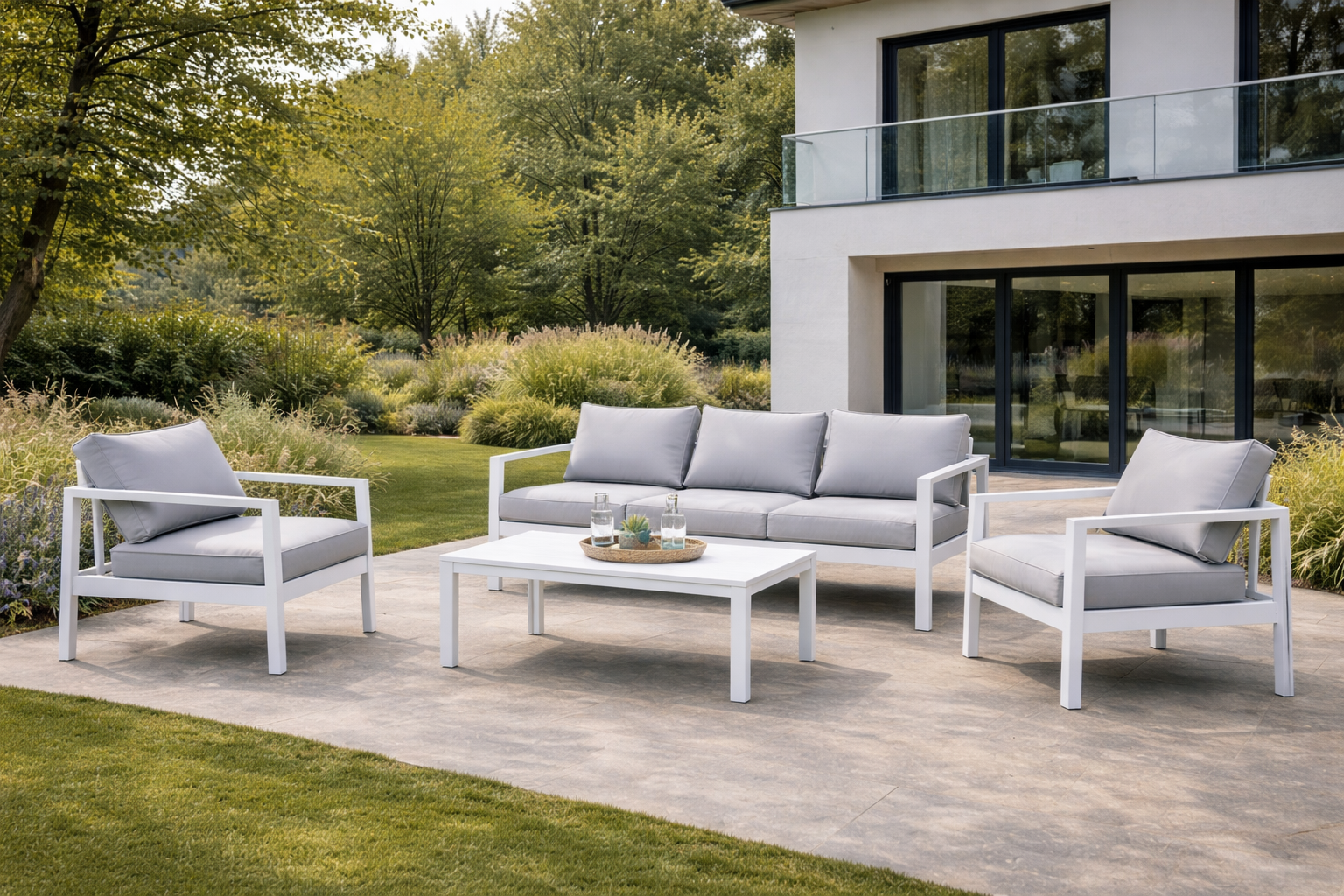 La struttura è realizzata in alluminio verniciato a polvere epossidica con finitura semiopaca, materiale leggero ma altamente resistente agli agenti atmosferici. Disponibile nelle raffinate colorazioni bianco, tortora e taupe, il set garantisce versatilità estetica e durata nel tempo.