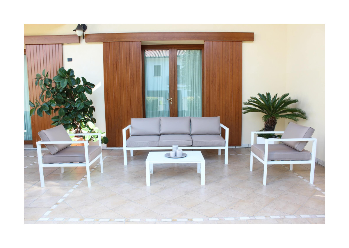 Questo salotto da esterno in alluminio rappresenta una soluzione elegante e funzionale per arredare giardini, terrazze, verande e spazi outdoor di ogni tipo. Il design essenziale e contemporaneo, unito alle finiture curate, lo rende facilmente abbinabile a contesti sia moderni sia più classici.