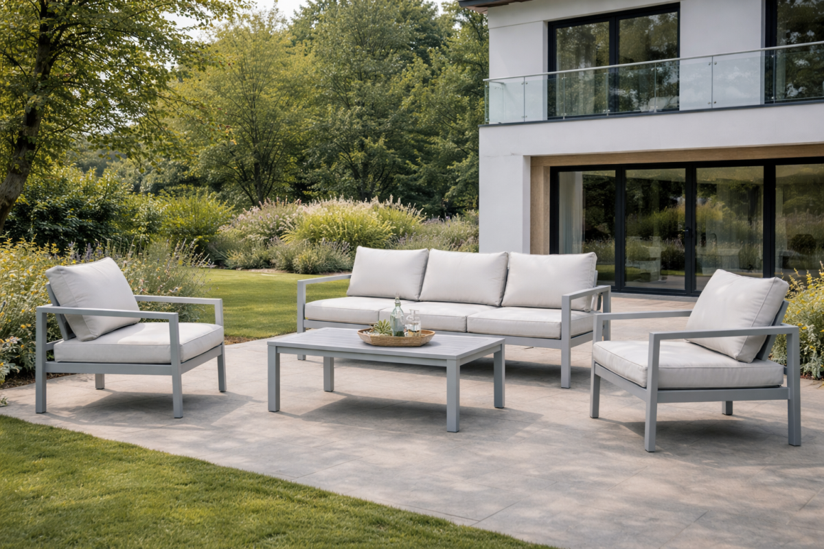 Questo salotto da esterno in alluminio è la soluzione ideale per arredare con stile e funzionalità giardini, terrazze e verande. Il design moderno ed essenziale, unito a materiali resistenti e di facile manutenzione, lo rende perfetto sia per l’uso residenziale sia per ambienti outdoor di strutture ricettive.