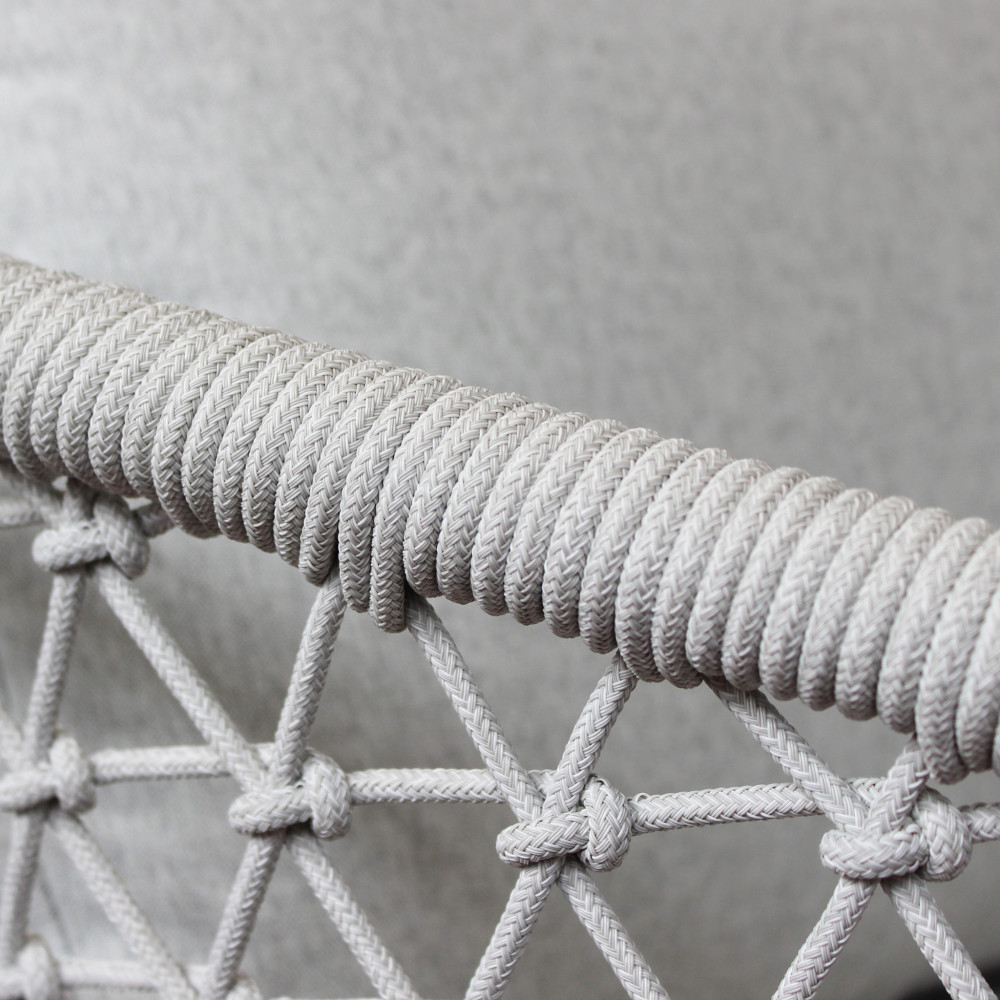 La struttura è realizzata interamente in alluminio anodizzato, verniciato a polveri epossidiche, trattamento che garantisce un’elevata resistenza alla corrosione, alla ruggine e agli agenti atmosferici, assicurando durata e stabilità nel tempo. Il rivestimento in corda intrecciata a mano rappresenta un elemento distintivo del set: prima dell’intreccio, la fibra sintetica viene sottoposta a speciali trattamenti che la rendono resistente ai raggi UV e alle intemperie, mantenendo inalterata l’estetica anche dopo un utilizzo prolungato all’esterno.