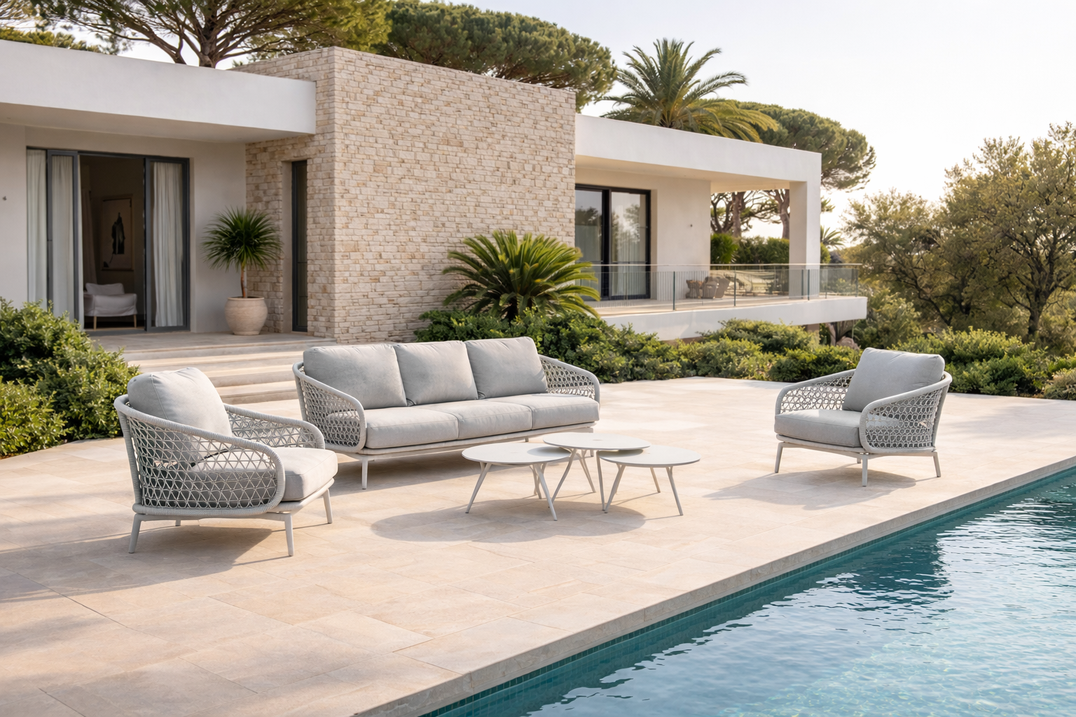 Il salotto da giardino oniuga innovazione, tradizione ed eleganza in una soluzione d’arredo raffinata e contemporanea, ideale per valorizzare giardini, terrazze e dehors con stile e personalità.