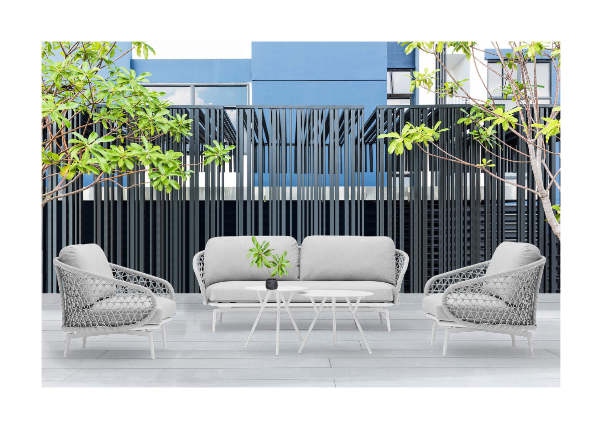 Il Salotto Seychelles è una soluzione di alto profilo per arredare con eleganza e comfort giardini, terrazzi e verande. Il design contemporaneo, caratterizzato dalla struttura in alluminio bianco abbinata alla corda in textilene grigio mélange, dona leggerezza visiva e uno stile raffinato, perfetto per ambienti outdoor moderni.