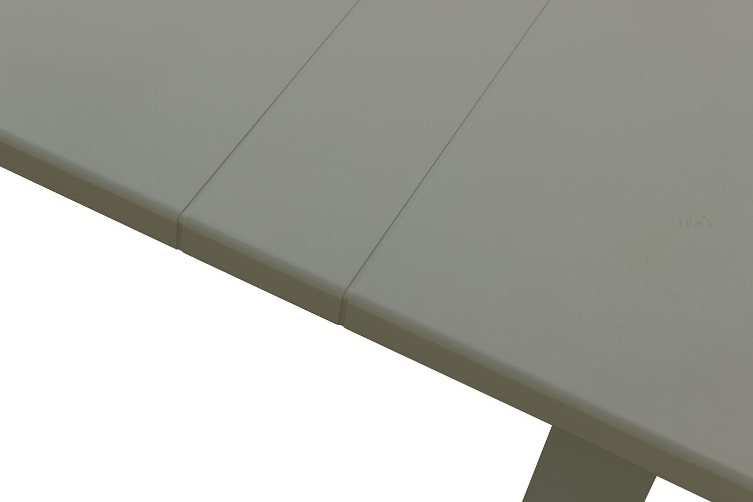Il tavolino in alluminio, dotato di base in materiale plastico, completa il set con praticità e stabilità.