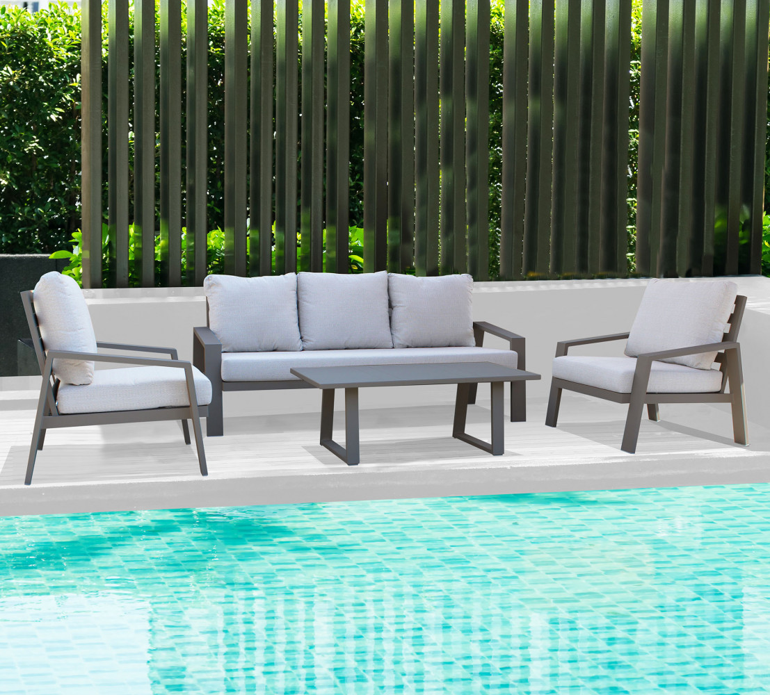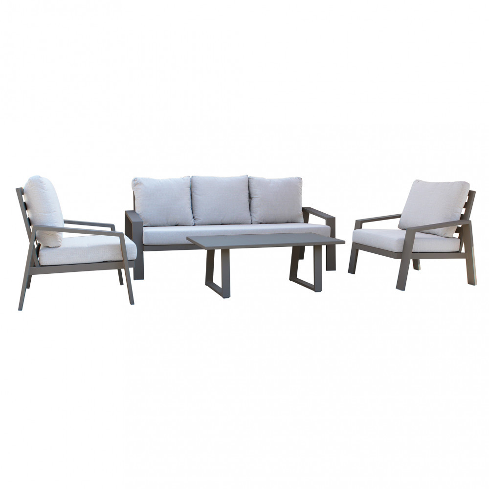 Dotato di telai in alluminio leggeri e resistenti e di un'imbottitura confortevole in poliestere di colore grigio scuro questo set da giardino è l?ideale per arredare con stile il proprio spazio esterno.