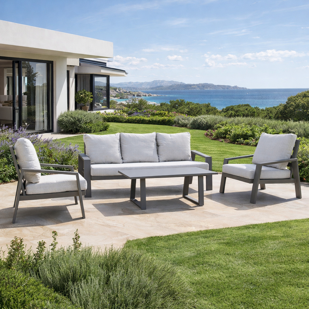 Il Salotto Santa Cruz è un set da giardino elegante e moderno, pensato per chi desidera arredare gli spazi esterni con stile, comfort e funzionalità. Il design essenziale e contemporaneo, valorizzato dal raffinato colore Taupe, lo rende perfetto per giardini, terrazze, verande e bordi piscina.