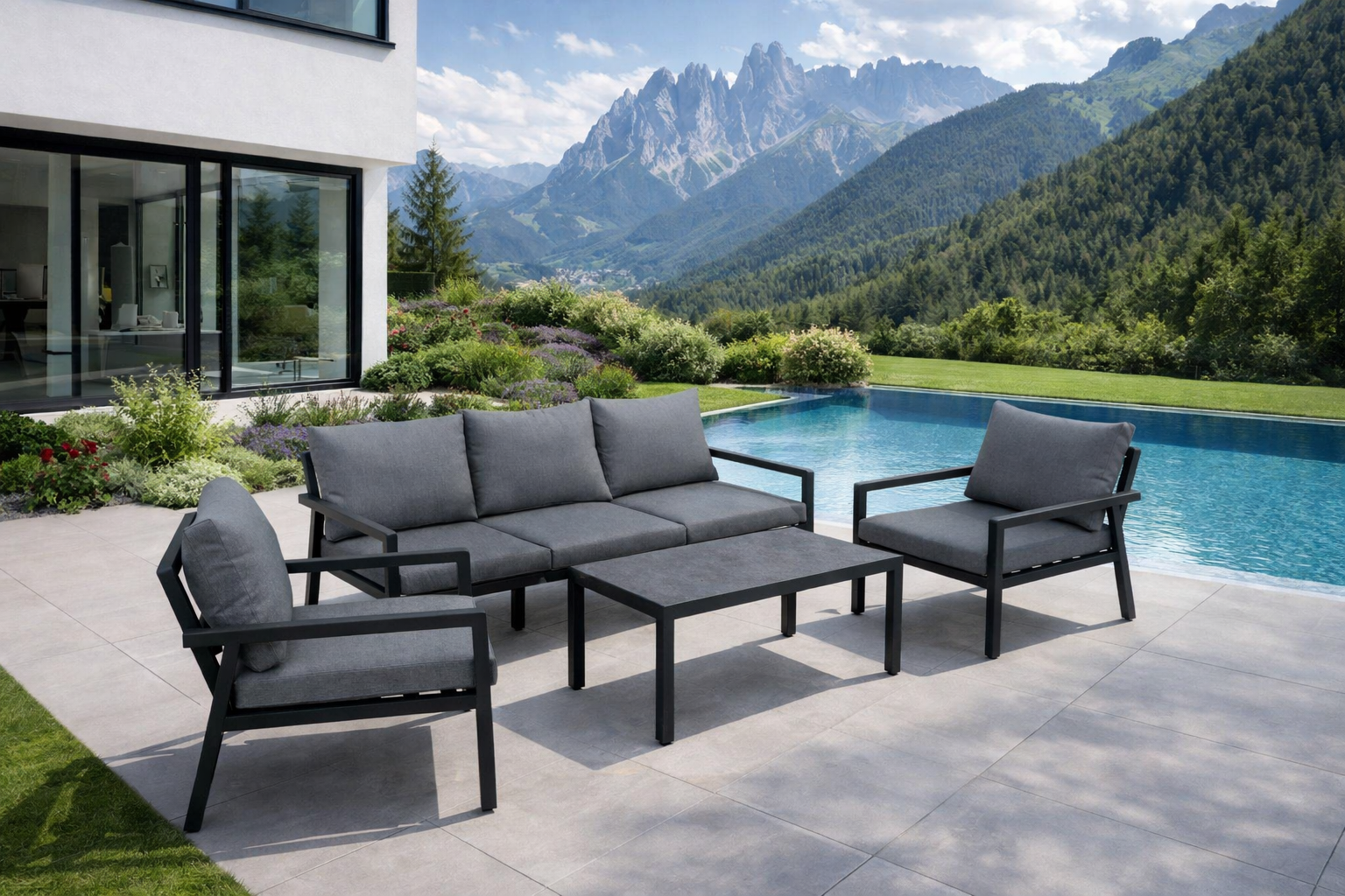 Il set è composto da un divano a tre posti, due comode poltrone con braccioli e un pratico tavolino, ideale per creare una zona relax accogliente e funzionale nel proprio spazio esterno.