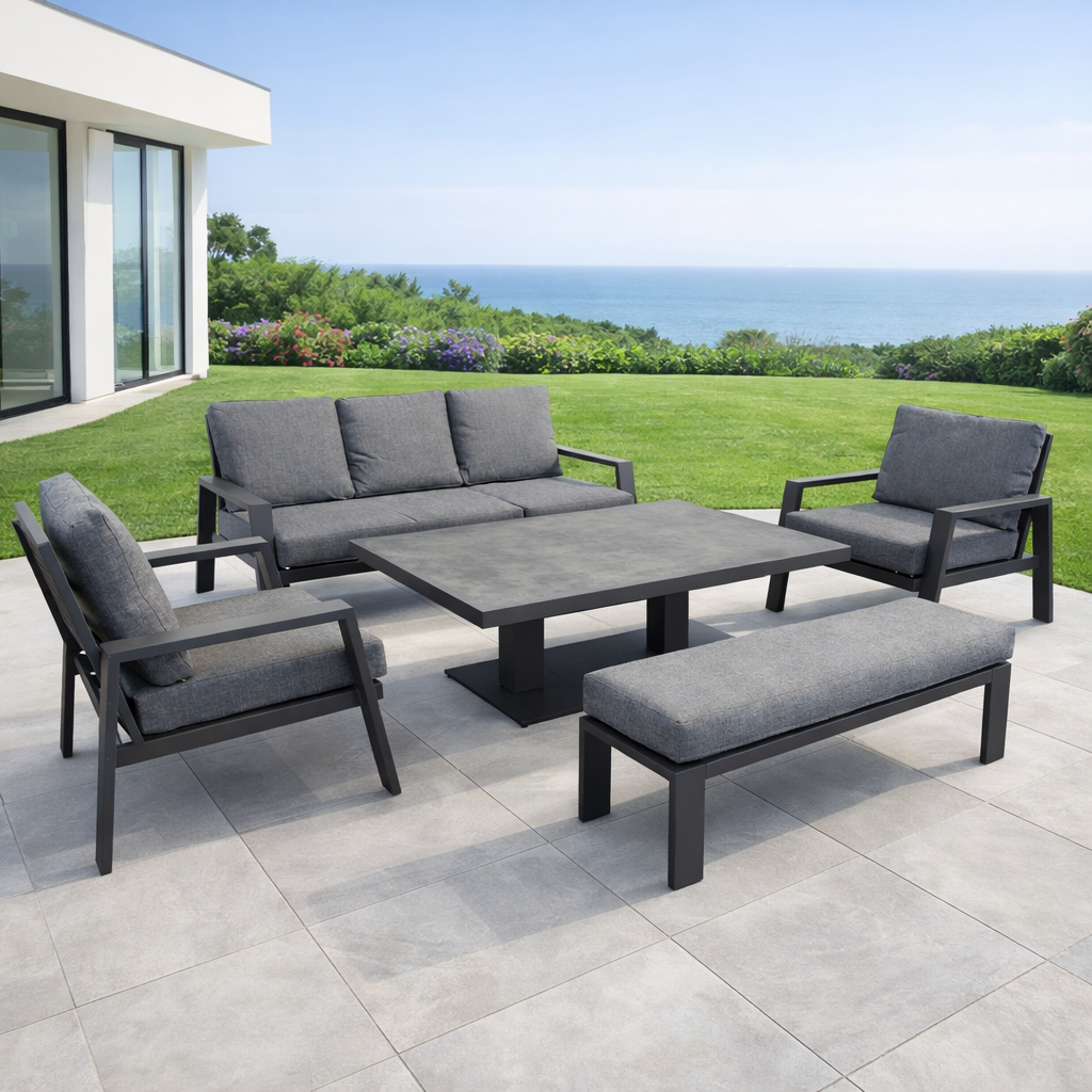 Il terrazzo è uno spazio da vivere e valorizzare appieno. Per questo nasce questo salottino da esterni dalle linee moderne, realizzato con struttura in alluminio verniciato antracite e completato da morbidi e confortevoli cuscini, ideale per creare una raffinata zona relax all’aria aperta.