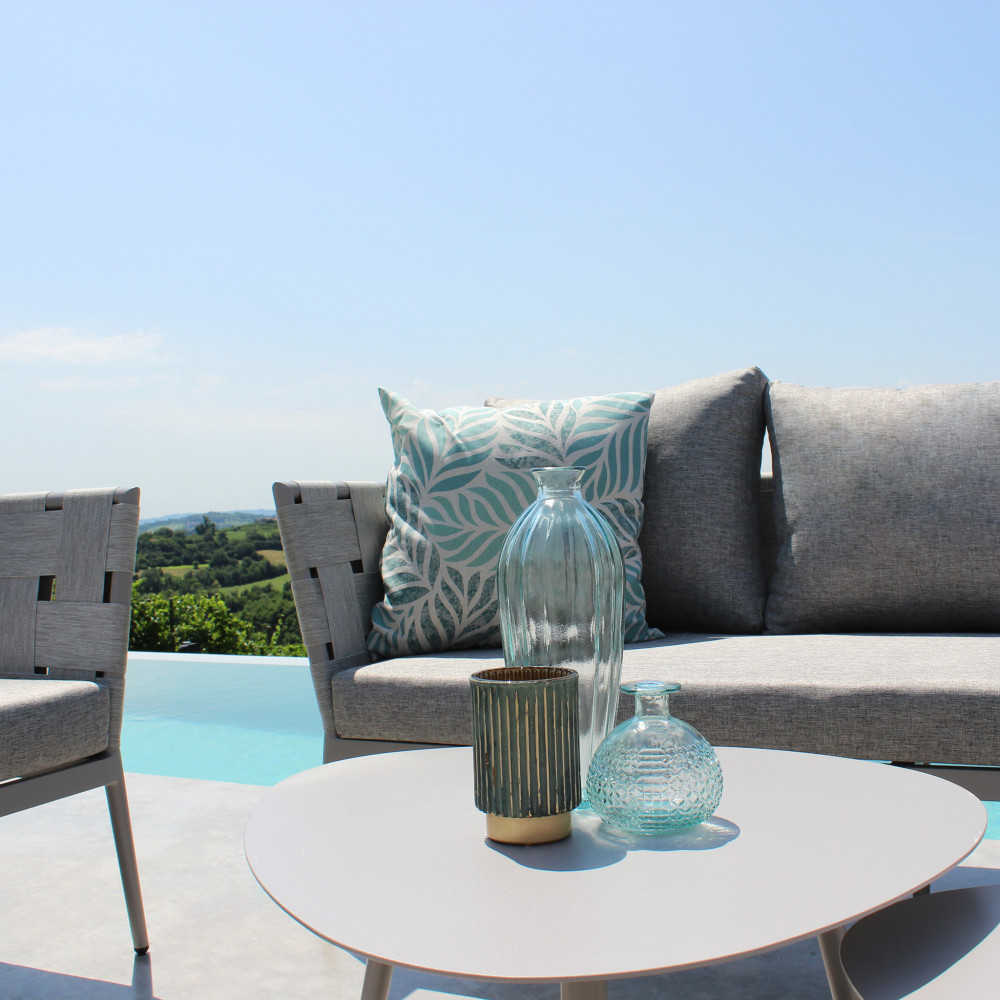 Il terrazzo è uno spazio da vivere e valorizzare appieno: nasce così questo salottino da esterno dalle linee moderne, realizzato con struttura in alluminio e completato da morbidi cuscini pensati per offrire comfort e stile in ogni momento della giornata.