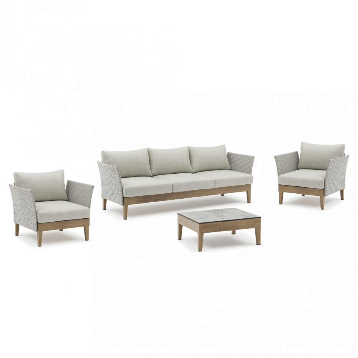 Salotto da giardino SANTOS divano 3 posti, 2 poltrone 1 tavolino alluminio effetto legno
